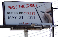 Quanto ao falso-profeta da vez, Harold Camping, da seita Family Stations, terão que saborear mais um fim sem começo. Espalharam em muitas cidades outdoors anunciando o ladrão com hora marcada, sendo que o marcado é o ladrão - o autor da roubada. Espero que os adeptos dessa seita não reajam como os daquelas acima, que dão a sua pele suada e sua testa coçada para justificarem os erros de quem um dia ousou dar uma de sabidão e alardeou: EU SEI! -